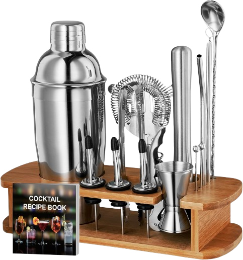 The Boston shaker and spout pourers allow for quick pouring and easy drink making while you’re in the midst of your New Year’s Eve party, while the muddler and bar spoon come in handy for recipes that call for a bit more precision or flair. Everything is neatly stored on a handsome wooden shelf that complements just about any setup.